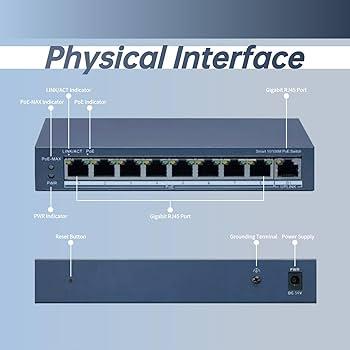 - 8 ports PoE 10/100 Mbps, 1 port Gigabit RJ45