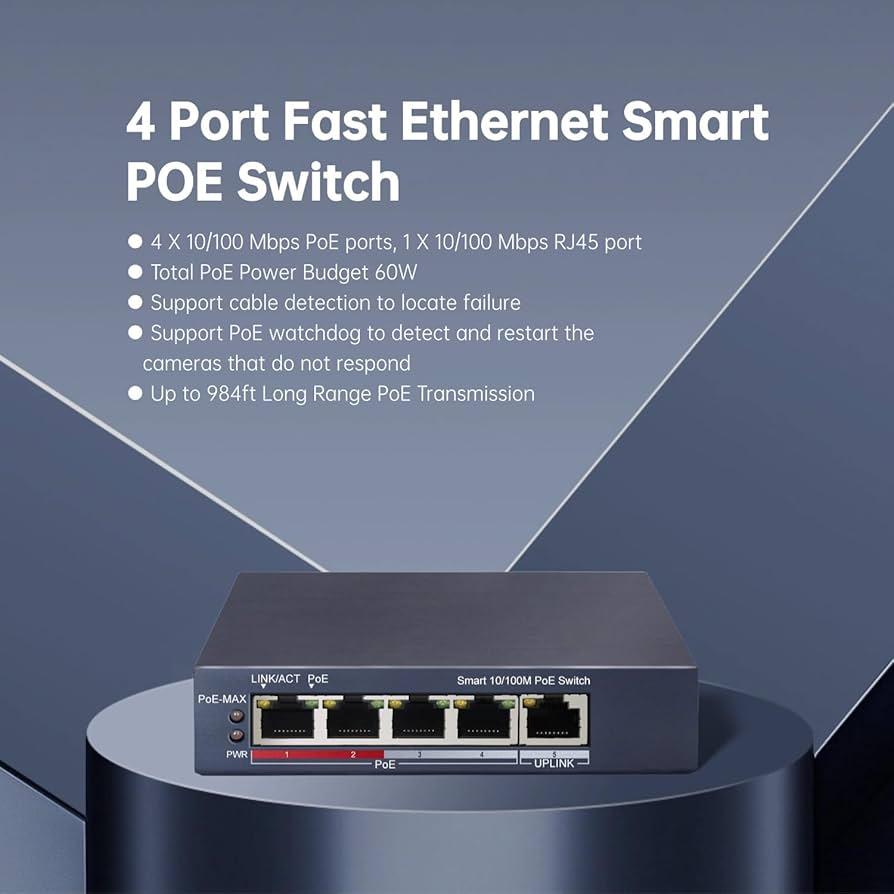 - 4 ports PoE 10/100 Mbps, 1 port RJ45 10/100 Mbps